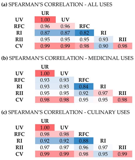 Spearman’s correlation matrices indicating the correlations among the number of use reports (UR), the use value (UV), the relative frequency of citation (RFC), the relative importance (RI), the relative importance index (RII), and the cultural value index (CV) for all uses (a), medicinal uses (b), and culinary uses (c). Spearman’s coefficient, the value in each cell for each combination of variables, is a measure of the strength and direction (negative or positive) of the association between the two indices and ranges from 0 (negligible association) to 1 (very high association). The lowest values per matrix are noted with dark blue color while the highest with dark red color, low and high values are noted using lighter blue and red colors, respectively, while intermediate values are white.