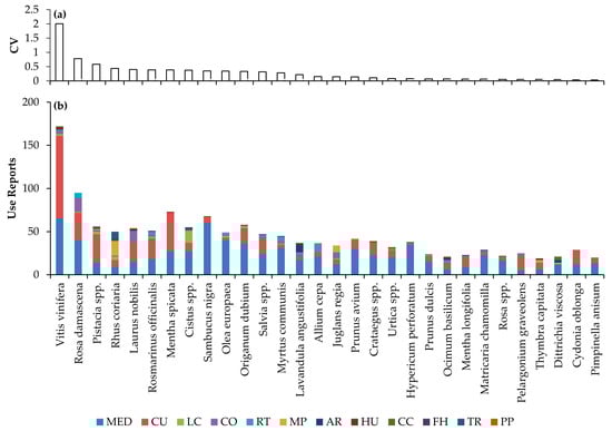 (a) The cultural value (CV), considering all uses, of the 30 more culturally significant taxa. (b) The number of use reports per taxa (bars) per use category (different colors per bar). Use categories: medicinal (MED), culinary (CU), livestock care (LC), cosmetics (CO), manufacture–processing (MP), religious traditions (RT), animal repellent (AR), crop care (CC), household use (HU), fishing–hunting (FH), trade (TR), poisonous plants (PP).