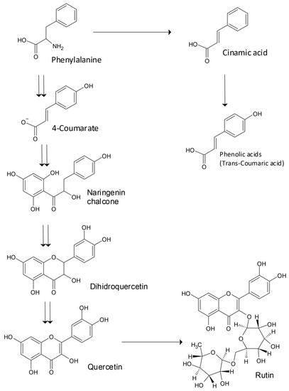 Several genes important for the regulation of quercetin and rutin biosynthesis have been identified [1]. The capability of buckwheat to survive under high levels of abiotic stress is due to the appearance of several gene groups involved in the transfer of signals, the regulation of the activity of genes, and the transfer of molecules. These genetic resources have facilitated the discovery of physiologically and nutritionally important plant genes, and the possibility of genetic improvement in Tartary buckwheat [1,5]. There are 769 gene groups involved in the evolutionary side branching of Tartary buckwheat and sugar beet, establishing the divergence of Caryophyllales before the separation of asterids and rosids [14]. Zhang et al. [1] reported that the ancestors of Tartary buckwheat and sugar beet split from each other about 85 million years ago. The basic biosynthesis pathway for the production of the flavonoids rutin and quercetin and phenolic acids is highlighted in Figure 1. The solar UV-B irradiation of plants may increase the amount of rutin and other UV-absorbing secondary substances in buckwheat grain and the green parts of plants [3,4].