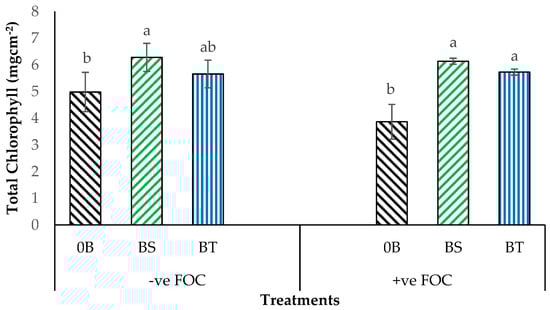 Significant interaction between different treatments on banana seedlings and antagonistic bacteria application on total chlorophyll (Chla+b) content at 6th WAT. Data are mean ± SEM (standard error of differences between means) of 24 replicates. Bars represent means followed by the different letters in lowercase, significant at p < 0.05. Soil uninoculated with FOC (−ve FOC) served as negative control, and soil inoculated with FOC (+ve FOC) served as positive control. 0B—without Bacillus spp., BS—B. subtilis, and BT—B. thuringiensis.