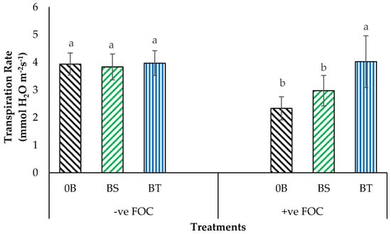 Significant interaction between different treatments of banana seedlings and application of antagonistic bacteria on transpiration rate at 6th WAT. Data are mean ± SEM (standard error of differences between means) of 24 replicates. Bars represent means followed by the different letters in lowercase significant at p < 0.05. Soil uninoculated with FOC (−ve FOC) served as negative control, and soil inoculated with FOC (+ve FOC) served as positive control. 0B—without Bacillus spp., BS—B. subtilis, and BT—B. thuringiensis.