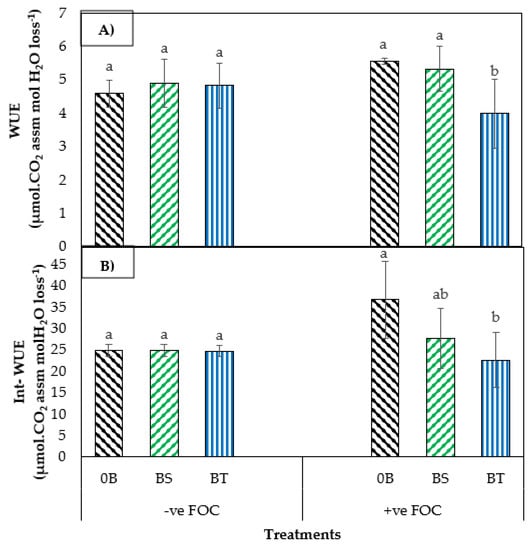 Effect of different treatments on banana seedlings and the application of antagonistic bacteria 6th WAT: (A) changes in water-use efficiency (WUE), and (B) changes in intrinsic-WUE (Int-WUE). Data are mean ± SEM (standard error of differences between means) of 24 replicates. Bars represent means followed by the different letters in lowercase, significant at p < 0.05. Soil uninoculated with FOC (−ve FOC) served as negative control, and soil inoculated with FOC (+ve FOC) served as positive control; 0B—without Bacillus spp., BS—B. subtilis, and BT—B. thuringiensis.