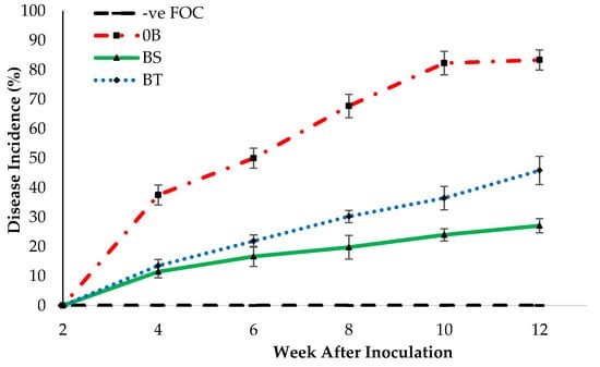 Based on the line graph in Figure 4, the negative control (−ve FOC + 0B) did not display Fusarium wilt symptoms till the end of the experiment. On the other hand, bananas grown on soil planting media challenged with FOC showed foliar symptoms of Fusarium wilt disease by a general yellowing of the older leaves and then wilting. The gradual development of disease symptoms was observed in the effects on the efficacy of Na2SiO3 combined with different species of antagonist bacteria (0B, BS, and BT) under the Fusarium stress condition. From these findings, a lower disease incidence (DI) indicates disease suppression by effective antagonistic bacteria combined with Na2SiO3 treatments. DI in treatments first and second week after FOC inoculation was 0%. The disease progression in Berangan banana was gradually increased with a DI rise of 45.83% observed at 12th WAT.