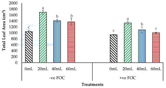 Significant interactions between different treatments on banana seedlings and application volume of SiO32− compounds on the total leaf area 9th WAT. Data are mean ± SEM (standard error of differences between means) of 32 replicates. Bars represent means followed by the different letters in lowercase significant at p < 0.05. Soil uninoculated FOC (−ve FOC) served as negative control, and soil inoculated FOC (+ve FOC) served as positive control.