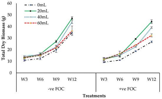 The total dry biomass presented in Figure 6 shows a significantly high interaction between treatments of banana seedlings and the application volume of SiO32− compounds. Application volume of SiO32− compounds exhibited significantly different total dry biomass at 6th to 12th WAT but were not affected at 3th WAT. Total dry biomass harvested from plants treated by Na2SiO3, 12th WAT was significantly increased by 35.02% (20 mL), 26.59% (40 mL), and 4.33% (60 mL), compared with 0 mL serving as the FOC-uninoculated control (34.86 g). On the adversative effect of Fusarium stress condition after 12th WAT, there was a substantial reduction of 23.06% in control inoculated with FOC equal to 26.82 g, compared with the negative control (−ve FOC). However, the application volume of Na2SiO3 under Fusarium stress condition significantly influenced the total dry biomass, thus indicating that the average total dry biomass 12th WAT was 20 mL, which had the highest total dry biomass (44.23 g), followed by 40 mL (39.08 g) and 60 mL (32.36 g), while 0 mL serving as control uninoculated with FOC showed the lowest total dry biomass with the mean value of 26.82 g.