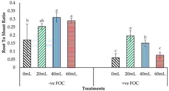 Significant interactions between different treatments of banana seedlings and application volume of SiO32− compounds on the root-to-shoot ratio 9th WAT. Data are mean ± SEM (standard error of differences between means) of 32 replicates. Bars represent means followed by the different letters in lowercase, significant at p < 0.05. Soil uninoculated with FOC (−ve FOC) served as negative control, and soil inoculated with FOC (+ve FOC) served as positive control.