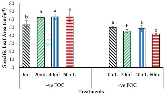 Figure 8 demonstrates that the SLA significantly increased by 17.22% (20 mL), 18.53% (40 mL), and 18.45% (60 mL) when Na2SiO3 was applied on banana seedling, compared with 0 mL which served as control uninoculated with FOC (53.36 cm2g−1). The SLA of Berangan seedling was significantly decreased by 6.09% with rising Fusarium stress condition, compared with the negative control (−ve FOC). The result of SLA is shown, thus indicating that the average SLA of Berangan banana seedlings 9th WAT was 0 mL of Na2SiO3, which had the highest SLA (50.11 cm2g−1), followed by 40 mL (49.00 cm2g−1), and 20 mL (45.55 cm2g−1), while 60 mL gained the lowest SLA (41.99 cm2g−1).