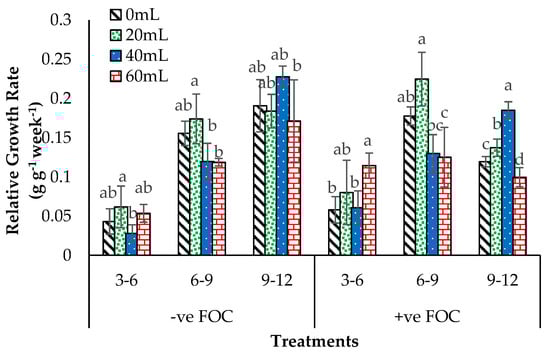Effect of different treatments of the banana seedlings and the application volume of SiO32− compounds throughout the 12th WAT on relative growth rate (RGR). Data are mean ± SEM (standard error of differences between means) of 32 replicates. Bars represent means followed by the different letters in lowercase significant at p < 0.05. Soil uninoculated with FOC (−ve FOC) served as negative control, and soil inoculated with FOC (+ve FOC) served as positive control.