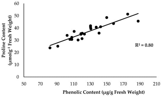 Kaushik and Saini (2019) [] stated that soil application by integration of SiO32− compounds with antagonistic bacteria is recommended as a good strategy for controlling disease in vegetable crop production. The amount of TPC started to increase from 81.52 to 175.15 µg/g fresh weight when the proline content of the Berangan banana plant started to increase from 23.79 to 51.34 µmolg−1 fresh weight under different treatments condition (Figure 10). There was a strong significance with positive results, suggesting that an increase in the accumulation of TPC is directly proportional to proline content in banana plant tissues. Constant disease suppression management leads to a good reduction in biotic stress as well as proline content accumulation; however, an increase in TPC is also a good result for plant defence and better growth performance of bananas. In addition, soil application with effective microbes enhanced the biochemical defence responses of cucumber plants for controlling Fusarium root and stem rot []. The results showed that proline, TPC, TFC, and lignin content in plant tissues significantly increased when the root of the banana was infected with FOC. According to [], the biochemical accumulation of proline, TFC, and TPC significantly increased, which contributed to the reduced root streak and leaf wilting observed in infected plants. Dong et al. (2020) [] reported that the lignin content of banana roots also began to accumulate at the early infection stage in order to prevent serious infection from FOC.