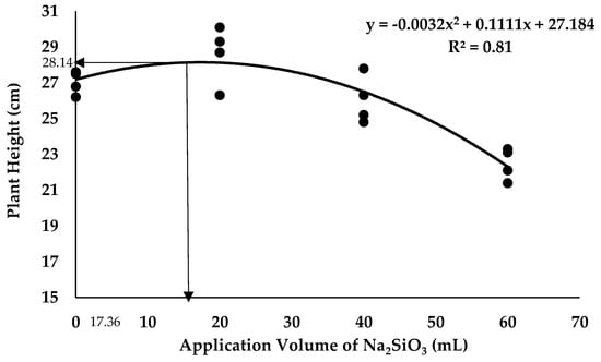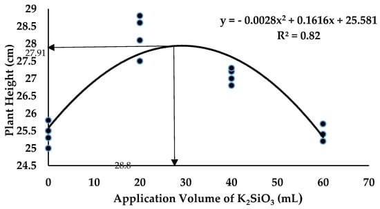 The most crucial growth rate performance that is closely related to plant development until harvest time is plant height []. Thus, the plant height of the banana is an indicator determining the optimum application volume of the SiO32− compound that is suitable to be applied. Regression analysis showed a polynomial trend between the plant height of the banana and the volume of K2SiO3 integrated with BS (Figure 11). Based on the result, the optimum volume of K2SiO3 was determined as 28.86 mL per plant. It seemed that soil application with K2SiO3 up to 28.86 mL with antagonistic bacteria significantly increased the plant height up to 27.91 cm; however, the plant growth performance of banana was reduced when the application volume applied more than the optimum volume. The regression analysis in Figure 12 showed that the optimum volume of Na2SiO3 was determined as 17.36 mL per plant suitable to be integrated with antagonistic bacteria. It seemed that application with the optimum amount of Na2SiO3 with antagonistic bacteria significantly increased the plant height to the maximum value of 28.14 cm under the Fusarium stress condition.