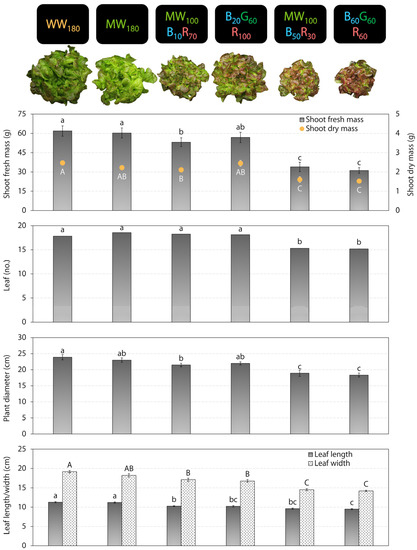 −1) progressively decreased lettuce shoot biomass, leaf size, and canopy size but increased red leaf coloration. In a previous study, increasing the blue photon flux density in blue + green + red LEDs from 0 to 100 μmol∙m