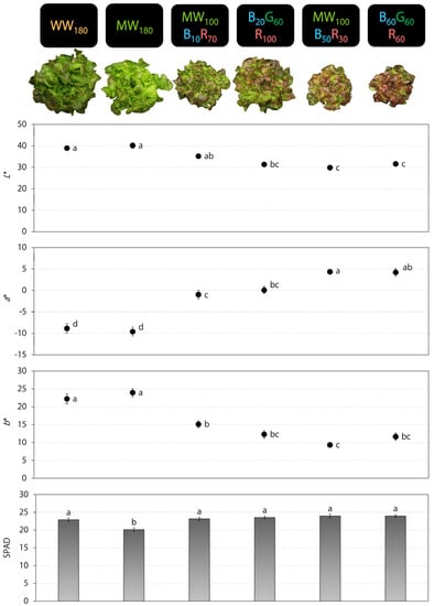 19], the low blue fractions in the two white spectra could explain the lack of red leaf coloration. In this study, lettuce grown under broad spectra with higher blue photon flux densities had redder leaves. Similar to our results, partially substituting equalized-white light with blue light increased red leaf coloration and anthocyanin concentration of red-leaf lettuce ‘Red Butter’ [