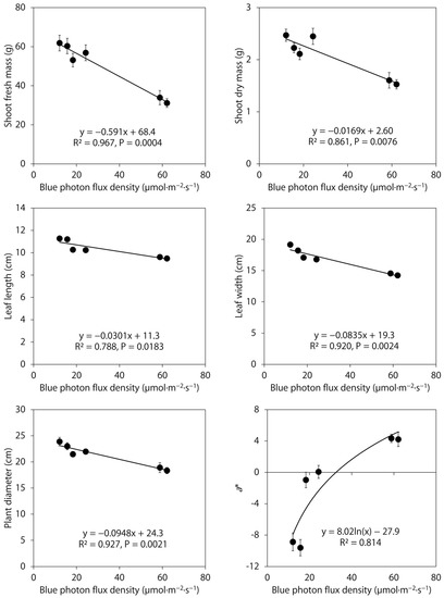 Figure 3). The blue photon flux density appears to accurately predict these lettuce phenotypes, although these models could be further strengthened in future research by including additional broadband spectra with intermediate blue photon flux densities, especially between 25 and 60 μmol∙m