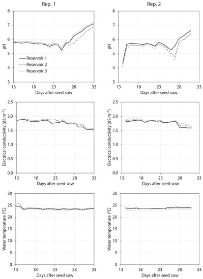 Figure 5). Whenever the pH was <5.1, we used potassium bicarbonate to raise the nutrient solution pH to 5.6–5.9 until day 28, after which we did not adjust it to observe the effects of plant nutrient uptake. Because 98% of the total nitrogen in the base fertilizer was in the nitrate form, maturing lettuce increased the nutrient solution pH. We replenished three reservoirs with deionized water periodically to ensure the water pumps were fully submerged in the reservoirs but did not provide additional fertilizers. Consequently, the nutrient solution electrical conductivity decreased gradually from 1.8 to 1.9 dS∙m