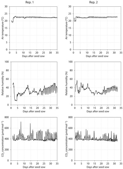 −1 during the first 24 h at an air temperature setpoint of 20 °C. Based on visual assessment, we achieved a uniform seed germination rate of >95%. We then grew seedlings under 180 μmol∙m