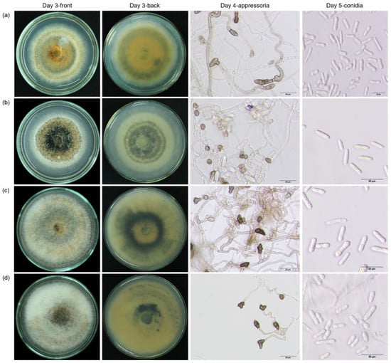 Each isolate was inoculated with a 6-mm-diameter plug taken from an actively growing edge of a 5-day-old culture on a PDA plate. The culture was incubated under the same condition mentioned above. Fungal growth and colony diameter were recorded daily until there were no changes in diameter (day 3). Fifty conidia were randomly selected for measurement of their length and width at day 5 (conidia were fully matured) under an Olympus CX31 binocular compound microscope at 400× magnification with the Olympus CellSens standard software version 1.16 (Olympus Co., Ltd., Tokyo, Japan). Appressoria were induced using a slide culture technique [47]. Briefly, the isolates were transferred onto 25.4 × 76.2 mm sterile microscope slides (7101 microscope slides, Shandong Harmowell Trade Co., Ltd., Shanghai, China) and covered with 22 × 22 mm coverslips (Menzel Gläser, Thermo Fisher Scientific Co., Ltd., Waltham, MA, USA) incubated in a petri dish at 25 °C until maturation, usually for 4 days. Lengths and widths of 30 appressoria per isolate were measured under a microscope. This experiment was performed in five replicates.