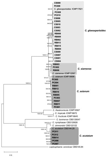 All DNA sequences of ACT, CHS-1, ITS, and TUB2 were subjected to BLASTn (Table S2). Sequences of ex-type or epitype strains of Colletotrichum species (Table S2) were selected for phylogenetic analysis. We firstly constructed a phylogenetic tree using two DNA markers: ITS and TUB2. A total of 47 isolates, including ten isolates of ex-type and ex-epitype or epitype strains, and Leptosphaeria veronicae CBS145.84 was used as an outgroup (Figure 3). The topology of the ML tree and Bayesian tree were identical, therefore, only the ML tree is shown. A discrete Gamma distribution was used to estimate the divergence and evolutionary rate (+G, parameter = 7.1107) (Figure 3). The 37 isolates were assigned to four species clades on the maximum likelihood (ML) tree. Of these, 19 isolates formed a clade that was closely related to C. gloeosporioides strain (ICMP17821), showing 0.13 posterior probability with a bootstrap value of 100%, three isolates were clustered with C. siamense (ICMP12567) with 0.01 posterior probability and a bootstrap value of 100%; ten isolates clustered with C. asianum (ICMP18696) with 0.00 posterior probability and a bootstrap value of 97%, and five isolates were grouped with C. acutatum (CBS144.29) with 0.02 posterior probability and a bootstrap value of 100%.