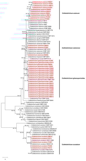 The maximum likelihood tree based on the concatenated data set of ACT, CHS-1, ITS, and TUB2 sequences from a total of 81 Colletotrichum species with the ex-type/epitype were retrieved from GeneBank. Numbers on the node are bootstrap values (left) and posterior probability (right). Colletotrichum isolates from this study are in red. The scale bar shows the number of substitutions per site.