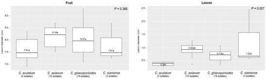 Box plots showing the variation of disease lesion diameter amongst four Colletotrichum species associated with mango anthracnose at 5 days after inoculation with a mycelial plug on unwounded NDMST mango fruit and leaves. Vertical lines are median. Means followed by the different common letter are significantly different according to the Tukey-test.