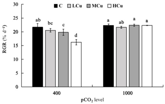 Relative growth rates of S. japonica grown under different pCO2 levels and copper concentrations. C (control, natural seawater); Lcu (low copper concentration, 0.2 μM); Mcu (medium copper concentration, 0.5 μM); Hcu (high copper concentration, 0.2 μM). All results are shown as mean value ± SD (n = 3). Different letters indicate statistical differences (p < 0.05) among experimental treatments.
