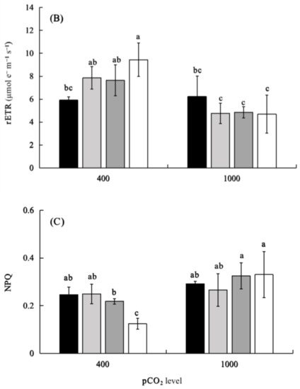 After the culture experiment, the chlorophyll fluorescence parameters of juvenile sporophytes were measured using a pulse modulation fluorometer (Imaging-PAM, Walz, Germany). Before determination, the samples were kept in the dark for 15 min. The basal fluorescence (F0) was obtained at low light, and the maximum fluorescence (Fm) was measured by the saturation pulse method with an intensity of 4000 µmol m−2 s−1. Fv/Fm was calculated using the equation Fv/Fm = (Fm − F0)/Fm. The rETR and NPQ were detected under actinic light in our experiments after 15 min of dark adaptation. The rETR = ΔF/Fm × PAR × 0.5, where ΔF/Fm represents the effective PSII quantum yield, PAR is the light irradiance, and 0.5 refers to the fraction of incident PAR absorbed by chlorophyll associated with PSII. NPQ was calculated as follows: NPQ = (Fm − Fm’)/Fm’, where Fm represents the maximum fluorescence after 15 min of darkness adaptation, and Fm’ represents the maximum fluorescence yield under actinic light.