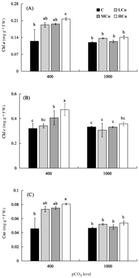 Chlorophyll a (A), chlorophyll c (B), and carotenoid content (C) of S. japonica grown at different pCO2 levels and copper concentrations. C (control, natural seawater); LCu (low copper concentration, 0.2 μM); MCu (medium copper concentration, 0.5 μM); HCu (high copper concentration, 0.2 μM). All results are shown as mean value ± SD (n = 3). Different letters indicate statistical differences (p < 0.05) among experimental treatments.