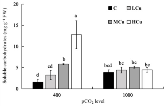 The soluble carbohydrate contents were significantly affected by pCO2 and copper individually and interactively (Figure 4, Table S1). At the lower pCO2 level, with the rise in copper concentration, the soluble carbohydrate contents at MCu and HCu were significantly increased by 273.44% and 718.75% compared to those in the control. However, at the higher pCO2 level, the soluble carbohydrate contents did not significantly differ at any of the copper concentrations. Additionally, under the HCu condition, the soluble carbohydrate contents at the higher pCO2 level were significantly decreased by 64.89% compared to those at the lower pCO2 level.