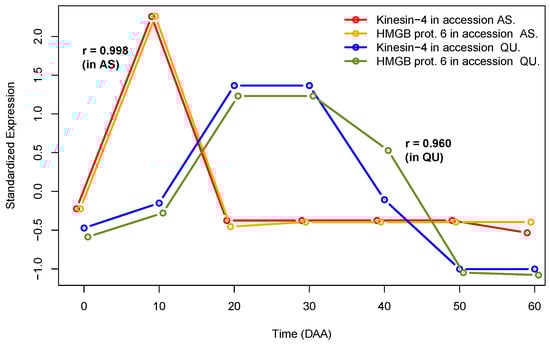 Figure 1 presents standardized expression profiles (SEPs) [,] for two genes (Kinesin-4 and HMGB prot. 6) in two different chili pepper accessions, “Ancho San Luis”, a domesticated accession, and the wild accession, “Piquín Quéretaro”, with keys “AS” and “QU” in the figure legend. We can see how these two genes present a highly congruent expression behavior within each one of the two independent genotypes (AS and QU), a fact that is reflected in very high values of Pearson’s correlations, 0.998 for AS and 0.960 for QU. Additionally, these correlation coefficients are highly significant, having p-values . In contrast, the two highly correlated gene pairs show distinct and uncorrelated expression profiles in the two different accessions (see Supplementary SI.2.1). We will see that, if correlation between the same pair of genes is found in various independent accessions, this strongly suggests that such a co-expressing gene pair could be indeed functionally related—even when the genes could have different and uncorrelated time expression profiles, as shown in Figure 1.