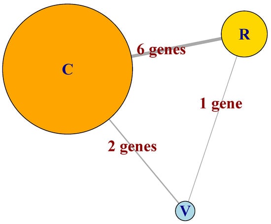 In Figure 5, we can appreciate the differences in size of the three GFN that form the MN, which include 29, 10, and four genes for the celcy (C), rep (R), and vir (V) GFN, respectively. We can also see that the three GFNs are inter-connected by sharing some genes between the GFN; six between celcy and rep, two between celcy and vir, and one between rep and vir. This last fact indicates that cell cycle (celcy), reproduction (rep), and response to virus (vir) in chili pepper are inter-dependent biological processes (BP).