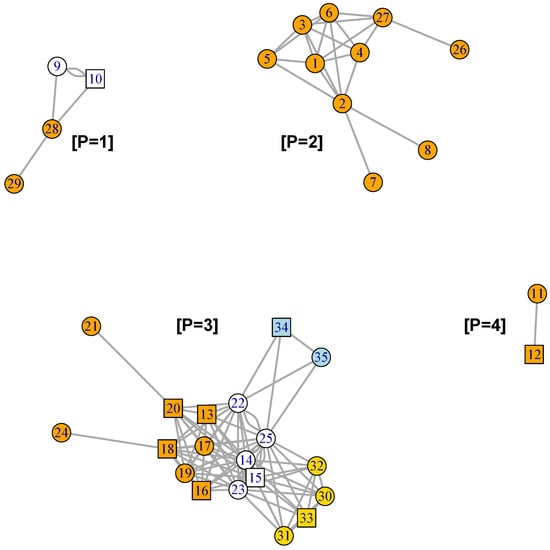 Graph of the MN formed by the 3 GFN. Genes found exclusively in BP celcy are colored in orange, the ones exclusively in rep are colored in golden yellow, and the ones exclusively in vir are colored in blue, while genes shared by two or more BP are in white. Disconnected sub-networks are annotated with labels [P = 1] to [P = 4] (Supplementary SI.5 for gene descriptions).