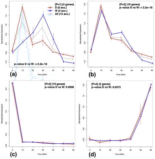 In Figure 6, we can appreciate that the MN is formed by four disconnected sub-graphs, annotated with labels [P = 1] to [P = 4]. These four disconnected sub-graphs include highly correlated genes, which present characteristic gene expression profiles. Figure 7 presents the plots of the average standardized expression profiles (SEPs) on time for gene patterns [P = 1] to [P = 4], in panels (a) to (d), respectively. In these four panels, grey lines represent the average in the 12 accessions—which include two crosses between a D and a W genotypes [], while red and blue lines represent the average in the six domesticated (D) and four wild (W) accessions, respectively. Thin vertical lines at each time point give the 95% confidence interval (CI) for the mean of standardized expression at each time and for each one of the groups.