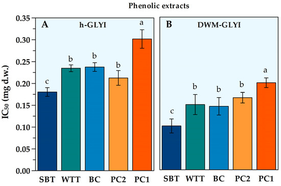 IC50 values for phenolic extracts from different plant foods, as obtained by both h-GLYI (A) and DWM-GLYI (B) assays. Data are reported as the mean value ± SD (n = 3). Different lowercase letters indicate significant differences at the p = 0.05 level, according to Duncan’s test. Abbreviations: SBT, ‘Sun Black’ tomato; WTT, wildtype tomato; BC, black carrot; PC1, Polignano carrot type 1; PC2, Polignano carrot type 2.