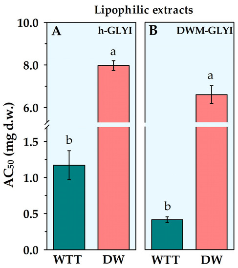 AC50 values for lipophilic extracts from wildtype tomato (WTT) and durum wheat (DW) whole grain, as obtained by both h-GLYI (A) and DWM-GLYI (B) assays. Data are reported as the mean value ± SD (n = 3). Different lowercase letters indicate significant differences at the p = 0.05 level, according to Duncan’s test.
