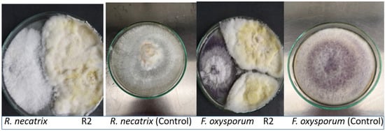 Fungal strains were observed to be potentially antagonistic to plant pathogenic fungi in this screening study, with growth inhibition ranging from 26.98% to 42.85% in the case of R. necatrix and 32.13% to 45.82% in F. oxysporum. Table 1 shows that the highest antagonism of the R2 strain against both pathogenic fungi was 42.82% and 45.82% against R. necatrix and F. oxysporum, respectively.