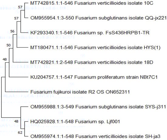 The MEGA 11 software’s ClustlW algorithm was used to align the resulting DNA sequences. The BLASTn tool was used to perform a homology search on the NCBI GenBank database (https://blast.ncbi.nlm.nih.gov/Blast.cgi; dated: 2 June 2022), and the fungal isolates were identified using the percent homology scores. The phylogenetic tree was produced with MEGA version 11 using the neighbor-joining algorithm, the position estimation technique, and bootstrapping analyses for 1000 replicates. Partial ITS regions of the rRNA sequences of the Fusarium isolate reported in this study were deposited in the GenBank nucleotide sequence databases (http://www.ncbi.nlm.nih.gov; dated: 2 June 2022) with accession number ON652311 (Fusarium fujikuroi R2 OS).