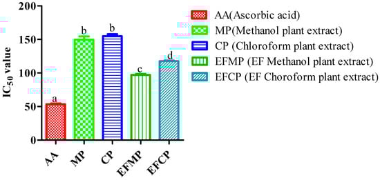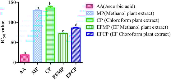 Both Stevia extracts (methanol and chloroform) reduced the oxidation activity of DPPH radicals because of the radical scavenging ability. The DPPH assay results revealed that when the extract concentration increased (20–100 µg/mL), the percentage inhibition of free radicals also increased. The greatest percentage inhibition was found to be 61.58 ± 0.51% in the methanol extract, while the chloroform extract demonstrated the least amount of inhibition at a concentration of 100 µg/mL (55.20 ± 0.81%). In the case of the control plants (non-inoculated), the DPPH radical scavenging activities of the extracts (methanol and chloroform) ranged from 19.46% to 41.94% and 17.16 % to 40.45%, respectively. The IC50 values of the control plant extracts (methanol and chloroform) were 129.676 µg/mL and 135.603 µg/mL, respectively, and in the case of the inoculated plant extracts (methanol, chloroform, and positive control), the IC50 values were 72.082 µg/mL, 85.78 µg/mL, and 18.86 µg/mL, respectively (Figure 3).