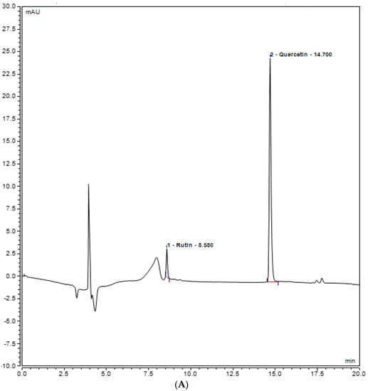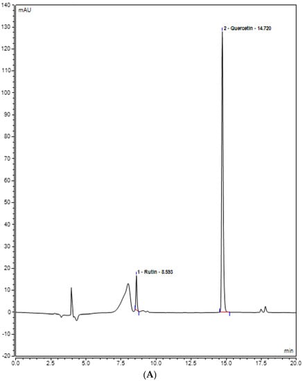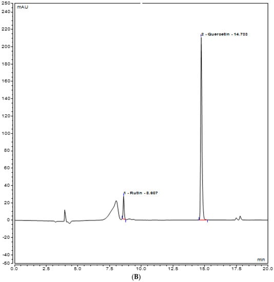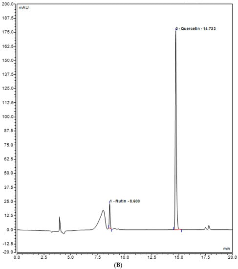 UHPLC chromatogram of polyphenols (Rutin and Quercetin) (A) methanol plant extract of inoculated S. rebaudiana with endophytic fungi, and (B) methanol plant extract of non−inoculated S. rebaudiana plant.
