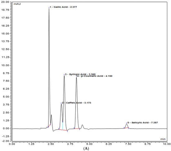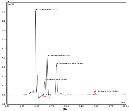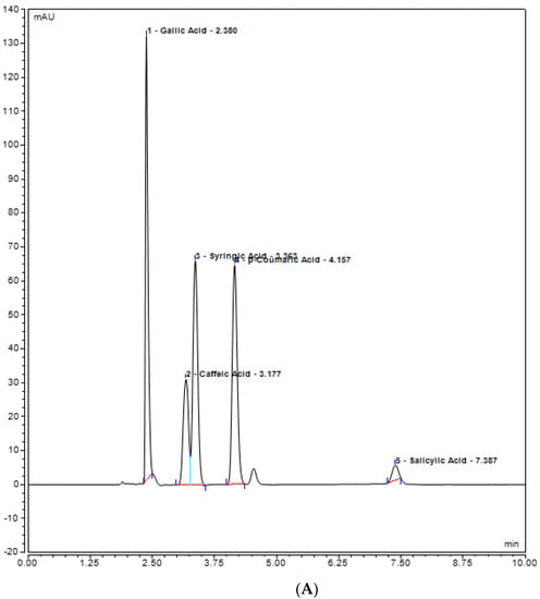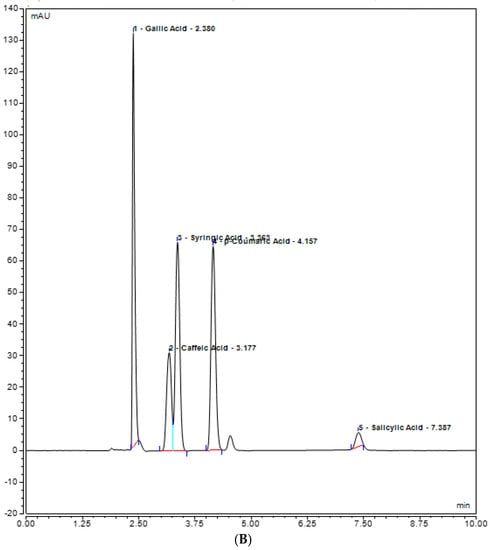 UHPLC chromatogram of polyphenols (Gallic acid, Caffeic acid, Syringic acid, p-coumaric acid, Salicylic acid) (A) chloroform plant extract of inoculated S. rebaudiana with endophytic fungi, and (B) chloroform plant extract of non−inoculated S. rebaudiana plant.