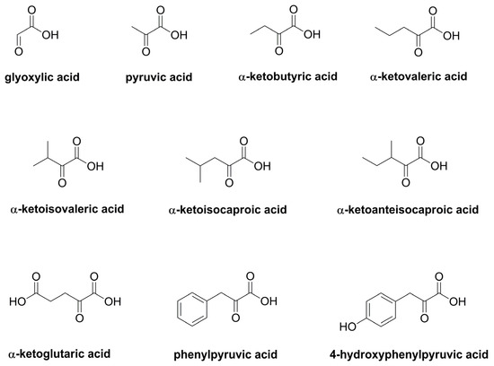 Using ultra-high performance chromatography coupled to tandem mass spectrometry (UHPLC-MS/MS) and multiple reaction monitoring, we determined the contents of ten α-keto acids (Figure 3) after conversion into their O-(2,3,4,5,6-pentafluorobenzyl)oxime derivatives by the method described by Noguchi et al. [15]. Among the thus quantified compounds were also the proposed key components pyruvic acid, α-ketoglutaric acid, α-ketoisovaleric acid, and α-ketoisocapronic acid (Figure S3). Additional relevant α-keto acids were retrieved by means of GC-MS and the method of Lee et al. [16]. A total of eleven α-keto acids were found in considerable amounts and commercial standards were therefore obtained. Of the eleven standards, however, oxaloacetic acid did not show useful results and had to be excluded.