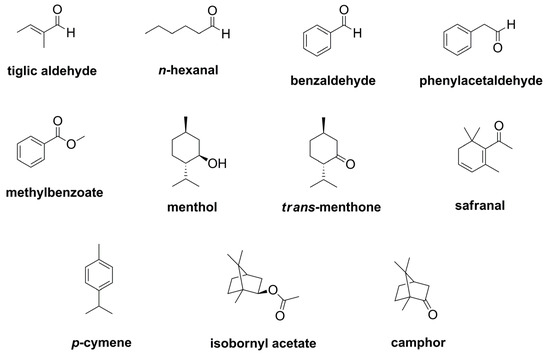 Moreover, all quantified compounds (except p-cymene in samples TC1 and TC2) showed concentrations above their respective olfactory threshold values (Table 3), and thus contribute to the aroma of blue fenugreek herb. Five compounds were found to predominantly affect the odor of blue fenugreek, namely the aldehydes tiglic aldehyde, phenylacetaldehyde, and n-hexanal, as well as methyl benzoate and trans-menthone (Table 4). Other compounds with values significantly above their olfactory thresholds were camphor, menthol, and benzaldehyde, as well as p-cymene in sample TC3.