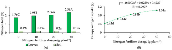 Figure 1. (A) Bar chart of nitrogen status on kaffir lime leaves and soil, and (B) regression curve of kaffir lime canopy nitrogen uptake under different nitrogen-fertilizer dosage. Note: mean values followed by the same letter are not significantly different based on DMRT at α 0.05.