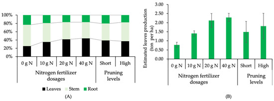Figure 2. (A) Biomass partition and (B) estimated leaf production (ton per ha) of kaffir lime under different nitrogen-fertilizer dosages and pruning levels.