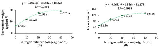 Figure 3. Regression curve of kaffir lime (A) fresh weight of leaves and (B) leaf numbers under different nitrogen-fertilizer dosages. Note: mean values followed by the same letter within the same curve are not significantly different based on DMRT at α 0.05.