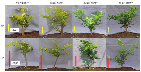 Aside from vegetative improvement, another advantage of best N-fertilizing practice is the regulation of assimilate translocation priority. N adequacy seemed to alter the assimilate translocation priority in kaffir lime plants. A N-sufficient plant, treated with both 20 g N plant−1 and 40 g N plant−1, showed a dominant portion of leaves, while a deficient plant likely had a large portion of stem. Concerning agribusiness profit, the leaf part of the kaffir lime is more valuable and profitable than the stem or even the root [7,9,10], due to the content of various beneficial phytochemicals such as citronellal, citronellol, citronellyl acetate, linalool and caryophyllene that contribute to the strong aromatic formed [12,58,59].