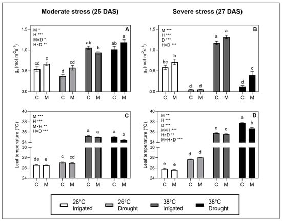 Stomatal conductance (gs) (A,B) and leaf temperature (C,D) measured in situ on plants during moderate stress (drought-stressed at SRWC ~50% and heat stress for 1 day) and severe stress (drought-stressed at SRWC ~20% and heat stress for 3 days). Values are mean ± SE. The effects of the three factors studied—heat stress (H), drought stress (D), melatonin treatment (M)—and their interaction are indicated in the left, upper corners of graphs. Significance levels are indicated by ***, p < 0.001; **, p < 0.01; *, p < 0.05, whereas factors with no significant effect (p > 0.05) are not listed. Lower-case letters on bars indicate differences between groups within each stress level significant at p < 0.05 in the post hoc multiple comparisons.