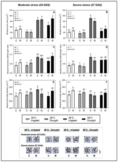 Stomatal anatomy from the abaxial leaf side on plants during moderate stress (drought-stressed at SRWC ~50% and heat stress for 1 day) and severe stress (drought-stressed at SRWC ~20% and heat stress for 3 days). Stomatal anatomy included abaxial pore area (A,B), abaxial stomata width/length ratio (C,D) and abaxial stomatal density (E,F) during moderate and severe stress. Values are mean ± SE. The effects of the three factors studied—heat stress (H), drought stress (D), melatonin treatment (M)—and their interaction are indicated in the left, upper corners of graphs. Significance levels are indicated by ***, p < 0.001; **, p < 0.01; *, p < 0.05, whereas factors with no significant effect (p > 0.05) are not listed. Lower-case letters on bars indicate differences between groups within each stress level significant at p < 0.05 in the post hoc multiple comparisons. Representative images of stomata from each treatment at each stress level are shown in subfigure below graphs. Scale bar (lower right corner), 25 µm.
