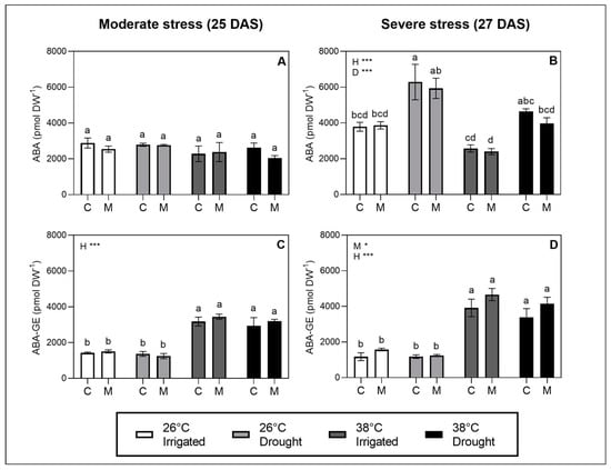 LC–MS analysis of ABA (A,B) and ABA-GE (C,D) performed on leaf material harvested during moderate stress (drought-stressed at SRWC ~50% and heat stress for 1 day) and severe stress (drought-stressed at SRWC ~20% and heat stress for 3 days). Values are mean ± SE. The effects of the three factors studied—heat stress (H), drought stress (D), melatonin treatment (M)—and their interaction are indicated in the left, upper corners of graphs. Significance levels are indicated by ***, p < 0.001; *, p < 0.05, whereas factors with no significant effect (p > 0.05) are not listed. Lower-case letters on bars indicate differences between groups within each stress level significant at p < 0.05 in the post hoc multiple comparisons.