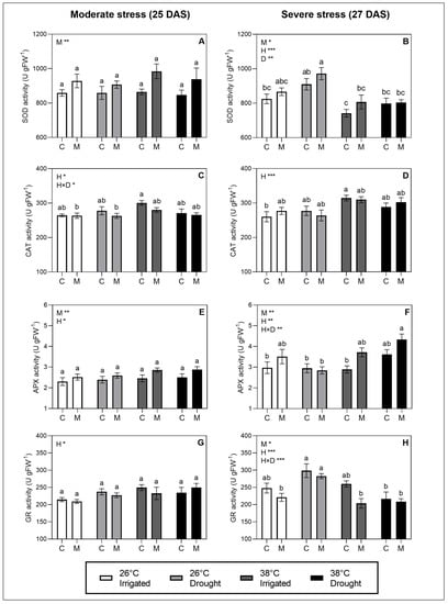 Enzymes assay on fresh leaf material for SOD (A,B), CAT (C,D), APX (E,F) and GR (G,H) at moderate stress (drought-stressed at SRWC ~50% and heat stress for 1 day) and severe stress (drought-stressed at SRWC ~20% and heat stress for 3 days). Values are mean ± SE. The effects of the three factors studied—heat stress (H), drought stress (D), melatonin treatment (M)—and their interaction are indicated in the left, upper corners of graphs. Significance levels are indicated by ***, p < 0.001; **, p < 0.01; *, p < 0.05, whereas factors with no significant effect (p > 0.05) are not listed. Lower-case letters on bars indicate differences between groups within each stress level significant at p < 0.05 in the post hoc multiple comparisons.