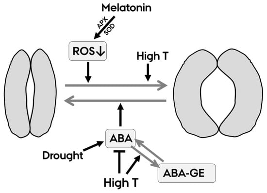 Many studies reporting biochemical and physiological effects in response to the exogenous application of melatonin suggest that melatonin does play various roles, with the potential to mitigate negative effects of abiotic stresses. It seems well established that exogenous melatonin can act to reduce ROS through the upregulation of radical scavenging enzymes [29,30,31,32]. The exogenous application of melatonin has also been shown to increase gs in plants exposed to various kinds of stress, such as in wheat recovering from cold stress [33] and in drought-stressed apple [34]. In recent reviews, it has been proposed that melatonin plays regulating roles in phytohormonal systems, such as ABA regulation [29,35]. It can be speculated that melatonin could exert effects on ABA metabolism and stomatal regulation through the modulation of ROS signaling, since the accumulation of ABA is induced by the generation of ROS and oxidative stress [36,37].