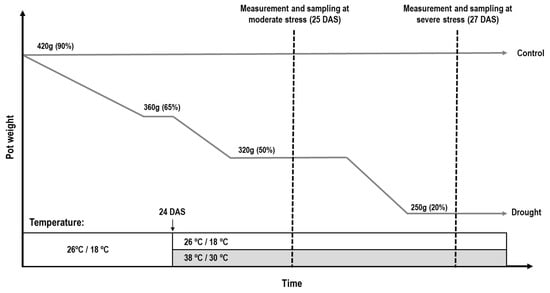 At 22 DAS, plants from the melatonin and control treatment were divided into four treatments: no stress (control), individual drought stress, individual heat stress and combined heat and drought stress. The stress treatments are depicted in Figure 6. The drought treatment was applied in two phases: moderate drought (soil relative water content (SRWC) = 50%) and severe drought (SRWC = 20%). First, the SRWC was ramped down gradually over 2 days to target weight of 360 g corresponding to an SRWC of 65%. When this was reached at the start of the day at 24 DAS, the heat treatment was initiated in the individual heat and combined stress treatments and the target weight for moderate drought stress was set at 320 g (SRWC = 50%). Physiological measurements and samples for moderate drought stress were collected after this target weight was reached for all plants in the drought and combined stress treatment, taking place at midday at 25 DAS. Hereafter, the target weight of the drought treatments was reduced to 250 g, corresponding to an SRWC of 20%. Physiological measurements and samples at the more severe drought conditions were made when this target weight was reached at 27 DAS. Plants of the control treatment and the individual heat treatment were maintained at SRWC of 90% throughout the whole experiment.